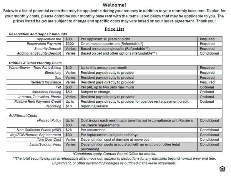 Price shown is Base Rent. Residents are required to pay the following: Application Fee ($30.00 Per Applicant 18 years or older, One-Time, At Application), Reservation Payment ($300, One time per apartment, Refundable*), Security Deposit (Varies, Based on screening results, Per Apartment, Refundable**), Additional Security Deposit (Varies, Based on pet and other options, Refundable**, Water/Sewer (Up to $55 per month per apartment, Utility, Usage Based, Nonrefundable), Recycling ($2 per month per apartment, if applicable, Nonrefundable), Electricity/Gas (Varies, Usage Based, Utility, Resident pays directly to provider), Renter’s Insurance (Varies, Resident pays directly to provider). Optional charges that may be applicable to the resident are as follows: Pet ($30 Per pet per month, Up to two pets maximum, Nonrefundable), Parking/Carport/Garage/Storage (Varies per property, per month, Subject to change, Nonrefundable, Refundable** deposit may apply), Internet, TV, Phone (Varies, Utility, Resident pays directly to provider), eProtect Policy (Up to $30, Cost incurs each month apartment is not in compliance with Renter’s Insurance requirements, Nonrefundable), Non-Sufficient Funds (NSF) ($25 Per occurrence, Nonrefundable) Key/FOB/Remote Replacement (Varies per property, Per replacement, Subject to change, Nonrefundable), Positive Rental Payment Credit Reporting ($2.00 per month per resident, Resident pays directly to CredHub, Nonrefundable), Turn Over Cost (Varies, Depending on cost of damage at move out), Legal/Eviction Fees (Varies, Depending on costs associated with an eviction or other legal proceeding). *Conditions apply. Contact Rental Office for details. **The total security deposit is refundable after move out, subject to deductions for any damages beyond normal wear and tear, unpaid rent, or other outstanding charges as outlined in the lease agreement.